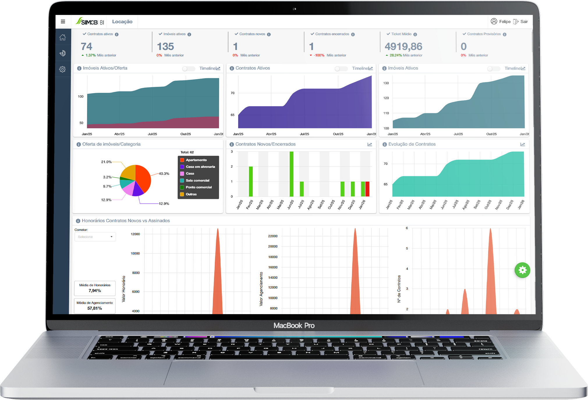 O módulo BI do SIMOB transforma a operação da imobiliária em informação visual e acionável.
